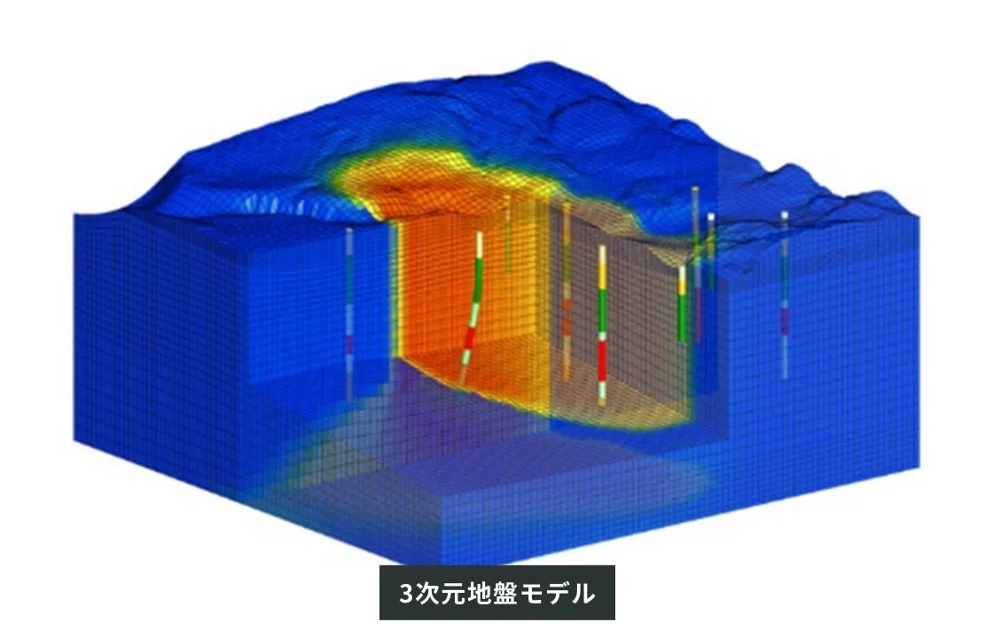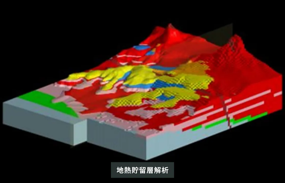 当社では、地熱開発候補地周辺の地盤を3次元でモデル化し、3次元地熱貯留層解析を行うことで、地熱資源の賦存状況や変動状況を3次元で明らかにします。